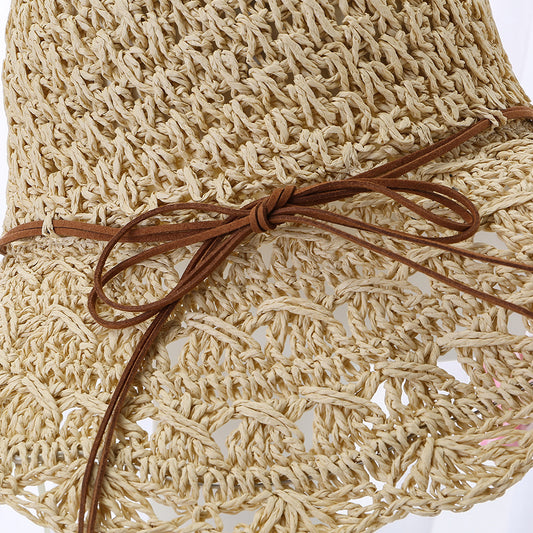 新しい夏のかぎ針編みの麦わら帽子女性の韓国風ファッショナブルな折りたたみ式革ロープサンハットビーチ海辺のサンハット
